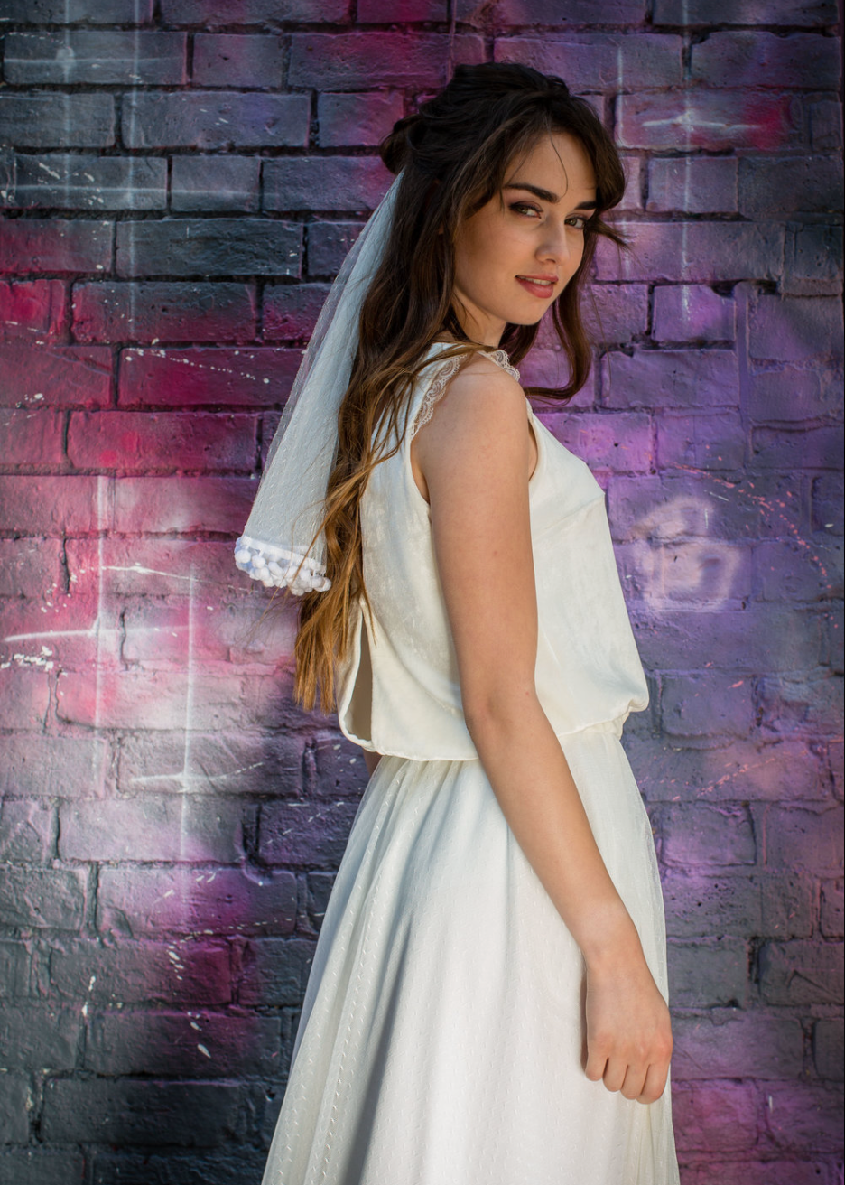 We are seeing short veils everywhere and think they are here to stay in 2023. Designers and brides are using them with both short and long dresses and they add a modern twist to any outfit. With the diversification of wedding venues and styles due to Covid, many of the old rules for veils have been thrown out the window, which we are delighted about. We think they will be worn both over the face as a blusher and around the back with a carefree attitude.